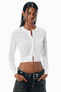 Clear beadhotfix creates a glossy wet look to this cropped cardigan in white. Styled with a crewneck, it is fastented by mother of pearl buttons. - mockneck - sleeveless - body composition: 100% viscose - trim: 77% viscose/21% polyamide/2% elastane - model is 5'9.5" and wears a size s - made in china - 1KC3243037104 composition Body/Exterieur: 100%VISCOSE Rib Trim: 77%VISCOSE/21%POLYAMIDE/2%ELASTANE