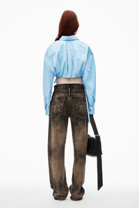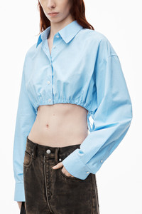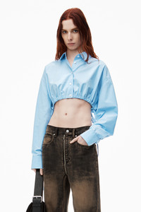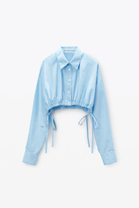 A drawstring hem defines this chambray blue cropped shirt, amplified by all-over crystal hotfix. The dropped shoulder offers ease to this stylized silhouette fastened by a button-front placket. - shirt collar - button cuffs - button up front - body composition: 100% cotton - made in China - oversize cropped fit, hits at waist - model is 5’11 and wears a size S - 1WC3241933423 composition Body: 100%COTTON