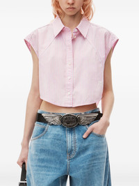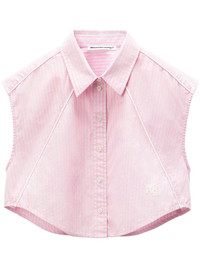 Defined by its cropped silhouette, this light pink striped cotton shirt showcases piping on the front, a point collar, and a shirttail hemline - mockneck - body composition: 100% cotton - relaxed fit - made in China - model is 5’8 and wears a size S - 4WC3241411685A composition Body: 100%COTTON