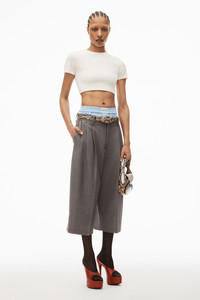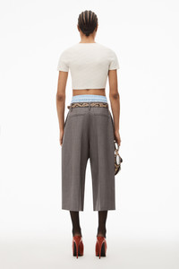 cropped short sleeve tee with allover custom logo jacquard in creamy bone stretch material - bodycon fit - hem hits above waist - composition: 56% polyamide / 39% viscose / 5% elastane - made in china - model is 5'10" and wears a size s - 4KC3231056131
