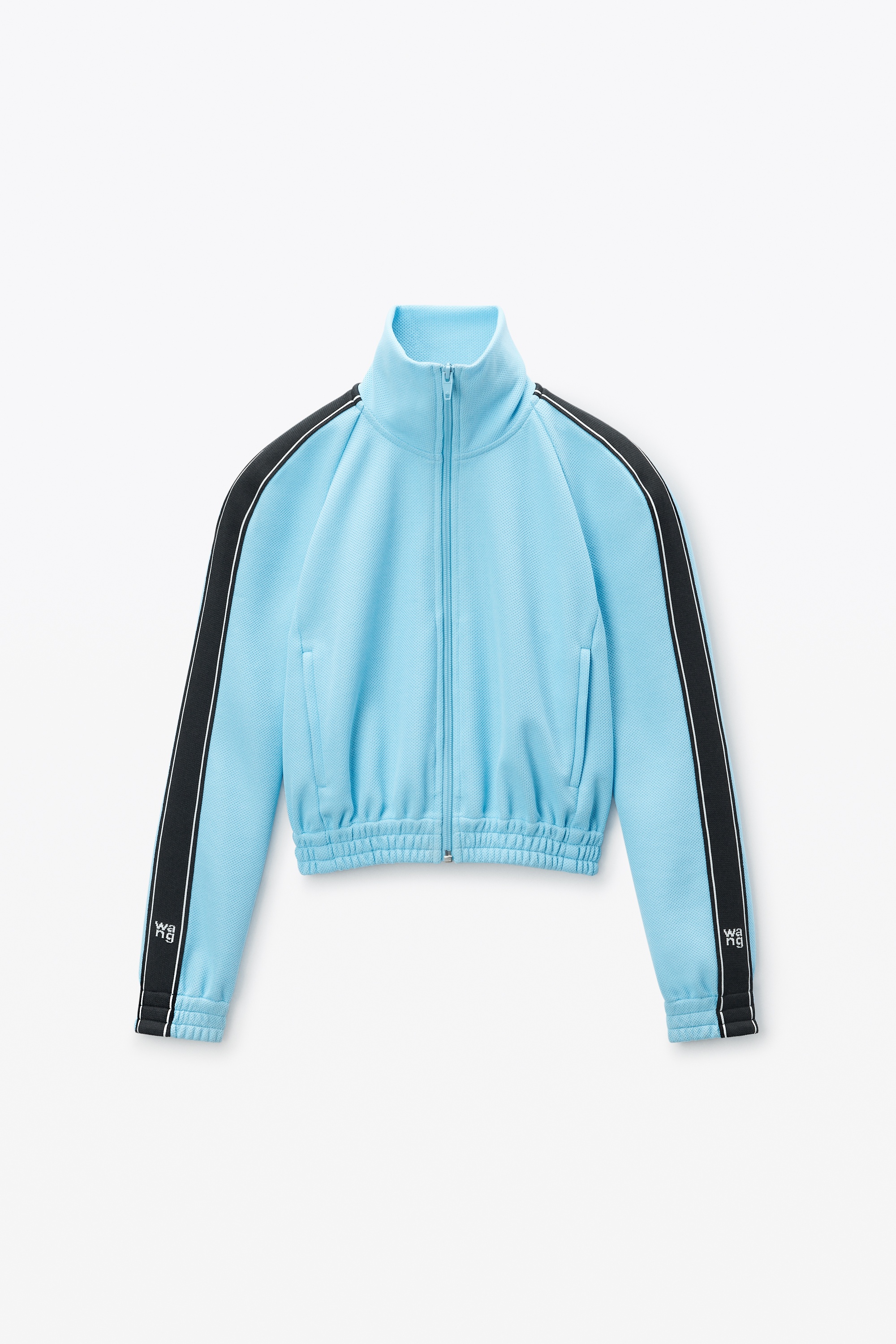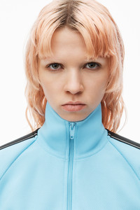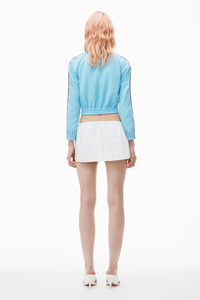 With its cropped fit, this blue long-sleeve track jacket features logo tape down the sleeves. A front zip fastens this relaxed silhouette, which is finished with an elasticized hem. - stand collar - long sleeves - body composition: 92% polyester/8% elastane - lining: 100% polyester - relaxed fit, hits at waist - made in China - model is 5’8 and wears a size s - 4CC3242091451B composition Body/Exterieur: 100%POLYESTER