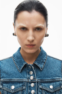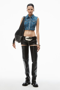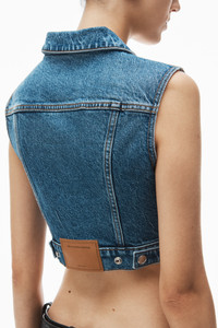 this shrunken cropped vest features a snap front, classic trucker detailing, and darting throughout. with a slim-fit design, this versatile layering style features a cotton-denim stretch construction in an indigo wash. - point collar - long sleeves - snap front, cuffs - body composition: 55% cotton/44% lyocell/1% elastane - made in china - model is 5’10" and wears a size 2 - 4dc4241505401 composition Body/Exterieur: 55%COTTON/44%LYOCELL/1%ELASTANE
