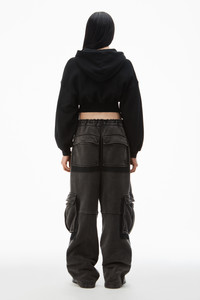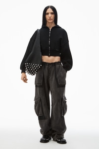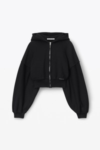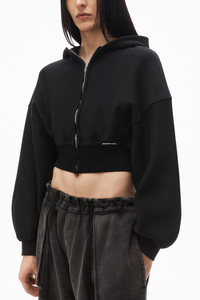Faded black cropped zip up hoodie in classic unbrushed terry with matching rib trim at hem and cuffs, wavy zipper, and logo label at left ribbed hem - relaxed fit with fitted waist - hits above waist - cut on cross grain, overdyed, and finished with acid wash - unlined - body composition: 100% cotton - rib composition: 99% cotton/ 1% elastane - made in Portugal - model is 5'11" and wears size s - 4CC1242077020A composition Body: 100%COTTON Rib: 99%COTTON/1%ELASTANE