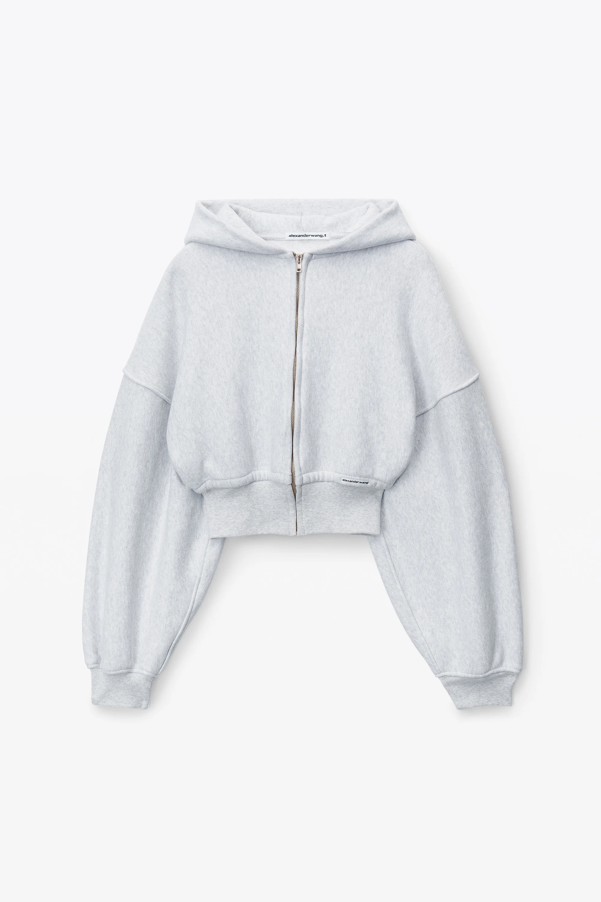 Light heather grey cropped zip up hoodie in classic unbrushed terry with matching rib trim at hem and cuffs, wavy zipper, and logo label at left ribbed hem - relaxed fit with fitted waist - hits above waist - cut on cross grain, overdyed, and finished with acid wash - unlined - body composition: 100% cotton - rib composition: 99% cotton/ 1% elastane - made in Portugal - model is 5'9" and wears size s - 4CC1242077050 "