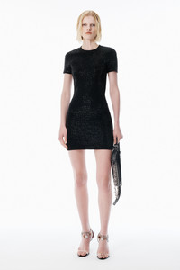 Designed in black boiled wool, this mid-weight ribbed crewneck dress features short sleeves and a fitted thigh-length silhouette. Over 79,000 crystal hotfix embellishments cover the surface, while rib trims and a woven alexanderwang logo tag finish the look. - crewneck - short sleeves - pulls on - hits at thigh - body composition: 92% wool / 7% polyamide / 1% elastane - made in China - model is 5'11" and wears a size s - 1KC4256065001 composition Body: 92%WOOL (OVIS ARIES ARIES)/7%POLYAMIDE/1%ELASTANE Rib: 92%WOOL (OVIS ARIES ARIES)/7%POLYAMIDE/1%ELASTANE