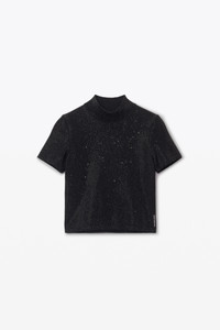 this black top's boiled wool construction results in a bodycon silhouette. it reveals an allover crystal hotfix, finished with a logo at the hem. a mock neckline and rib trim complete this silhouette. - mock neck - pulls over - body composition: 92% wool/7% polyamide/1% elastane - trim: 92% wool/7% polyamide/1% elastane - made in china - model is 5’10" and wears a size s - 1kc4246044001 composition Body/Exterieur: 92%WOOL (OVIS ARIES ARIES)/7%POLYAMIDE/1%ELASTANE RIB TRIM: 92%WOOL (OVIS ARIES ARIES)/7%POLYAMIDE/1%ELASTANE