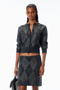 Graphite wool blend cardigan in a shrunken long-sleeve silhouette. Embellished with 28,000 crystals in an allover argyle pattern across the body and sleeves, and finished with tonal corded “aw” embroidery above the hem. Rib trims frame the edges for a smooth, close fit. - graphite - ribbed crewneck and trim - long sleeves - button closure - shrunken close fit - Body composition: 92% wool/7% polyamide/1% elastane - Trim: 93% wool/6% polyamide/1% elastane - model is 5'11" and wears a size s - made in china - 1KC1263028531 composition Body: 92%WOOL (OVIS ARIES ARIES)/7%POLYAMIDE/1%ELASTANE Trim: 93%WOOL (OVIS ARIES ARIES)/6%POLYAMIDE/1%ELASTANE