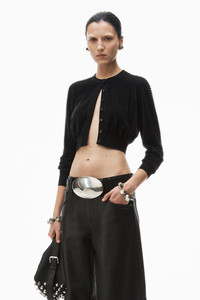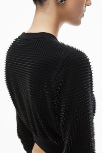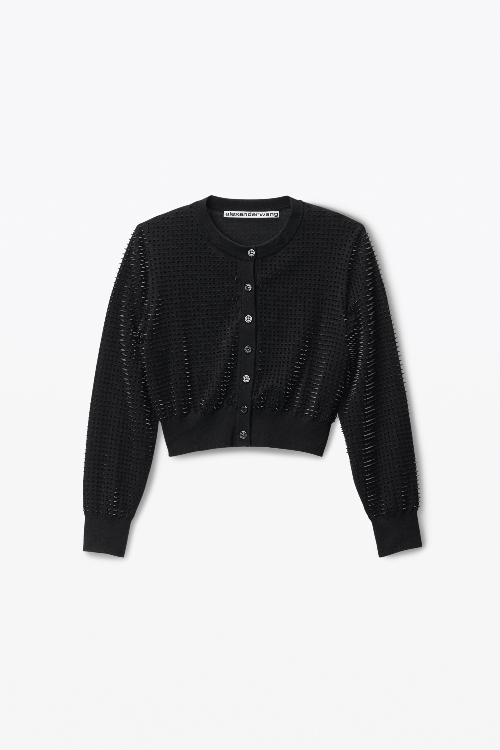 custom 3d-molded spikes amplify this black knit cardigan fastened by a button closure. - button closure - long sleeves - body composition: 38% cupro/31% polyamide/24% polyester/7% elastane - trim: 41% cupro/31% polyamide/25% polyester/3% elastane - made in china - dry clean - model is 5'10" and wears a size s - 1kc4243018001 composition Body/Exterieur: 38%CUPRO/31%POLYAMIDE/24%POLYESTER/7%ELASTANE RIB TRIM: 41%CUPRO/31%POLYAMIDE/25%POLYESTER/3%ELASTANE