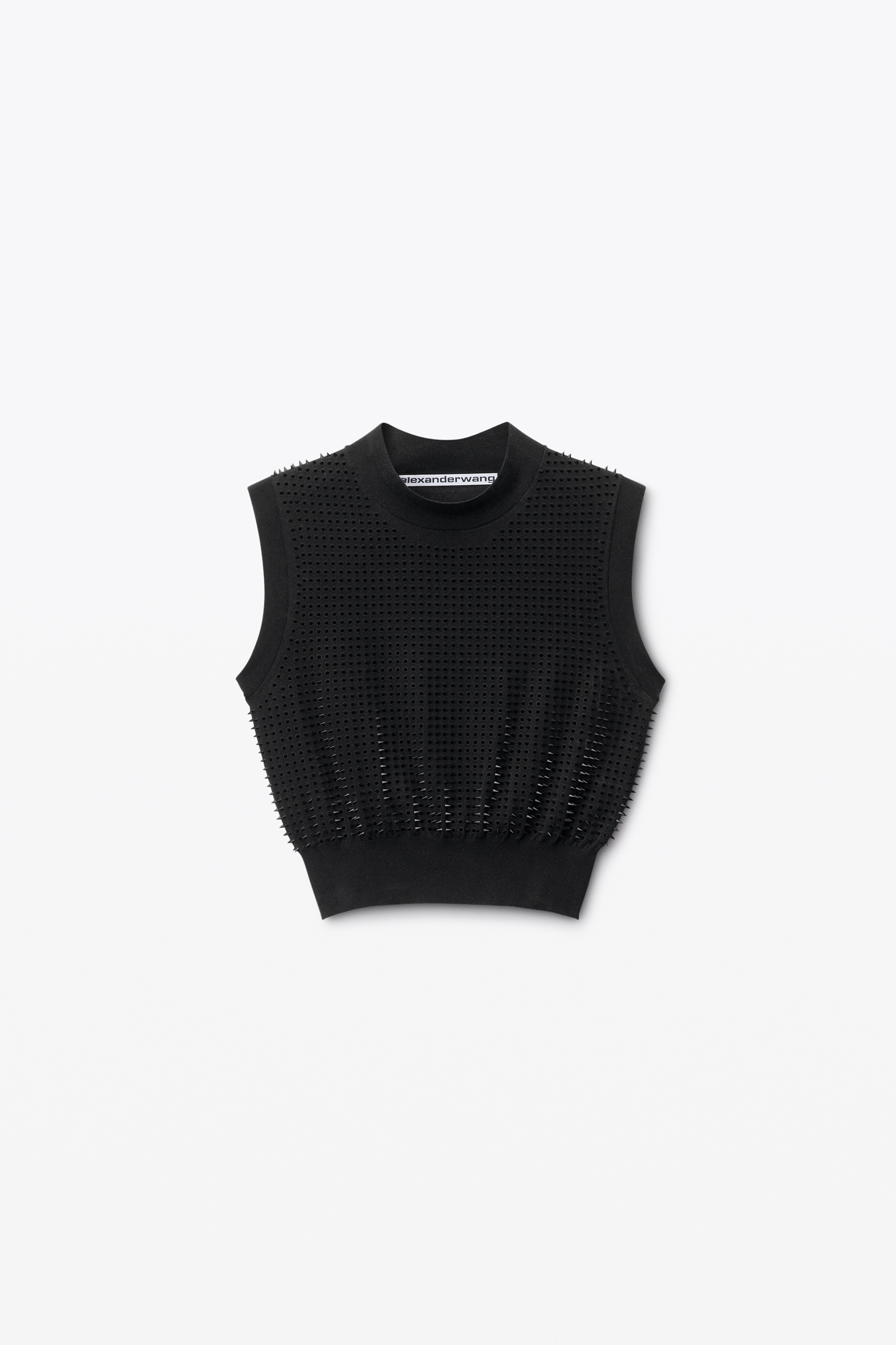 custom 3d-molded spikes amplify this black jersey knit tank top finished with sweater-rib trim. - mockneck - short sleeves - body composition: 38% cupro/31% polyamide/24% polyester/7% elastane - trim: 41% cupro/31% polyamide/25% polyester/3% elastane - made in china - model is 5’10" and wears a size s - 1kc4241023001 composition Body/Exterieur: 38%CUPRO/31%POLYAMIDE/24%POLYESTER/7%ELASTANE RIB TRIM: 41%CUPRO/31%POLYAMIDE/25%POLYESTER/3%ELASTANE
