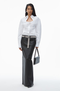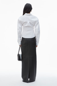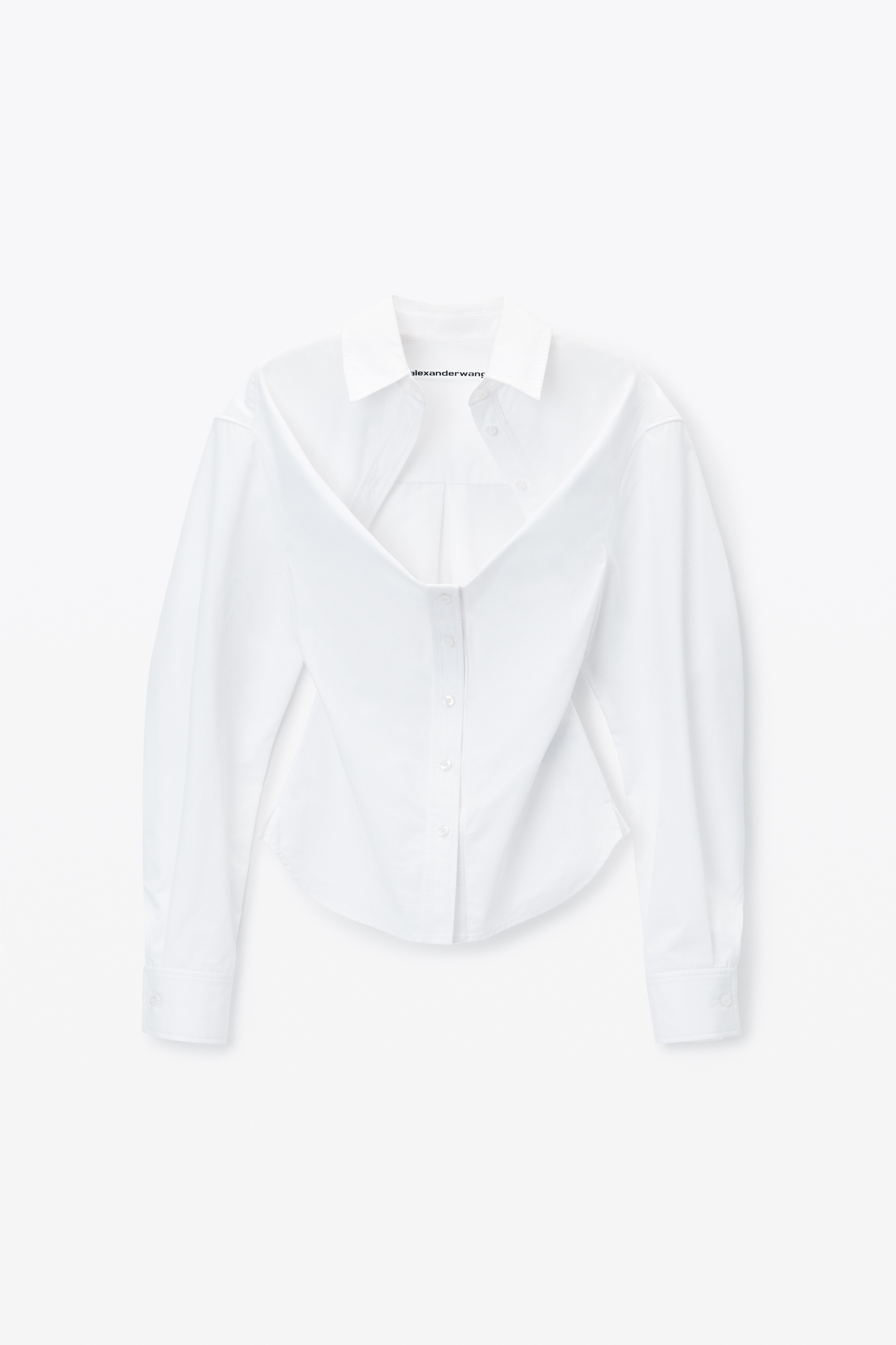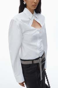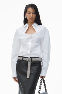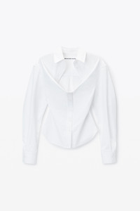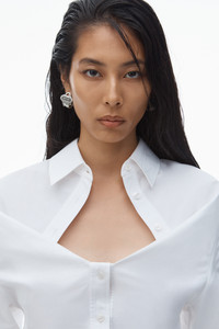 This deconstructed white cotton shirt features a sweetheart neckline with a relaxed bust and fitted bodice. Cut on the bias; this modern tailoring style is characterized by a dimensional front-tuck detail, wide sleeves, and a curved back seam to accentuate the silhouette. - spread collar - button closure - hits at waist - body composition: 100% cotton - model is 5'10.5" and wears a size 4 - made in china - 1WC1251978100 composition Body/Exterieur: 100%COTTON