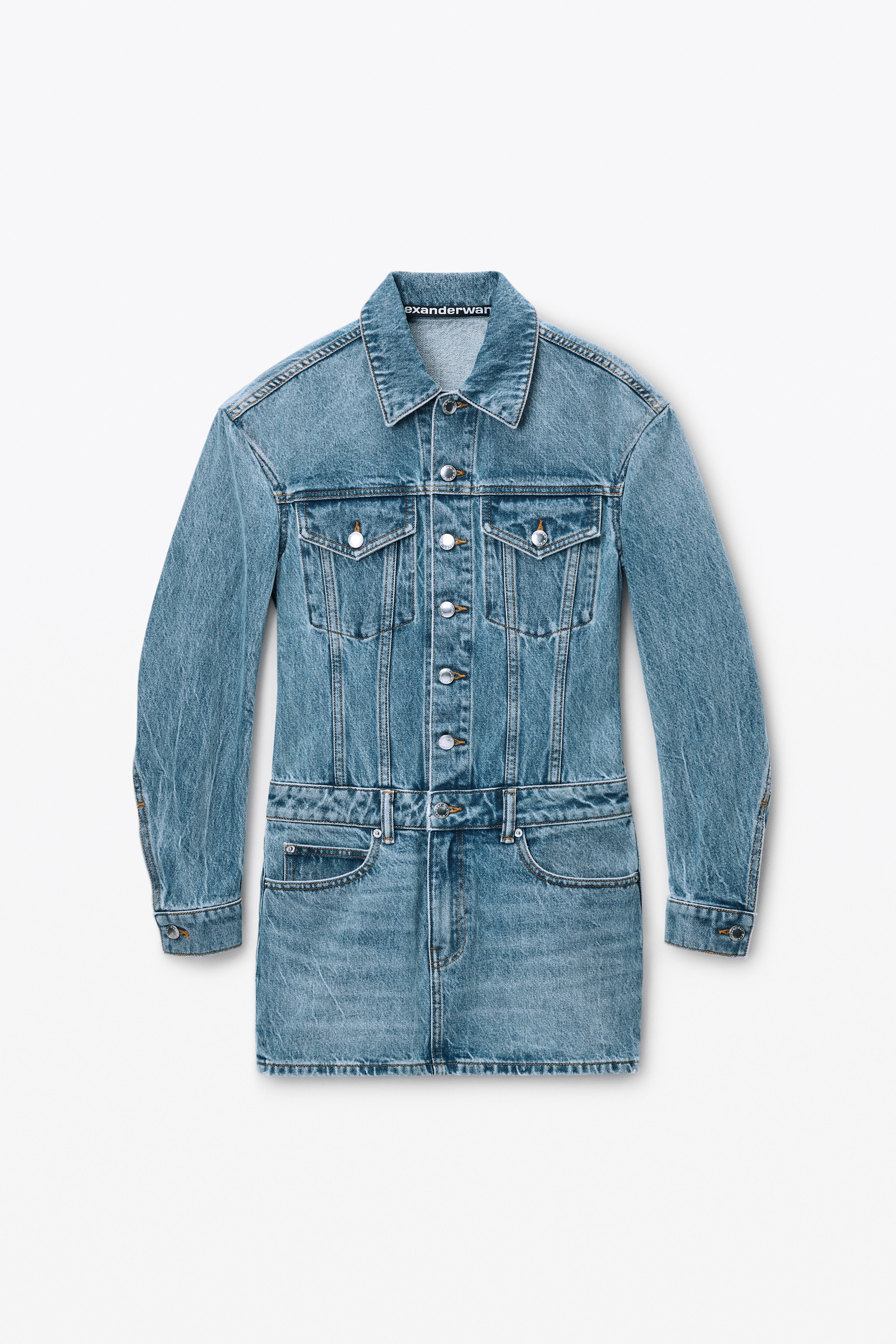 This minidress features a partial button-front bodice and a five-pocket-style skirt in cotton denim. Trucker-style detailing, articulated sleeves, and a high-frequency logo at the back pockets complete the look. - point collar - chest flap pockets - long sleeves - five-pocket design - body composition: 100% cotton - model is 5'9" and wears a size 4 - made in china - 4DC1256585486 composition Body/Exterieur: 100%COTTON