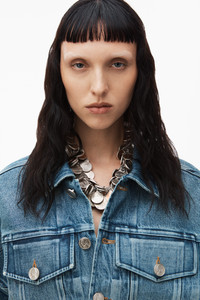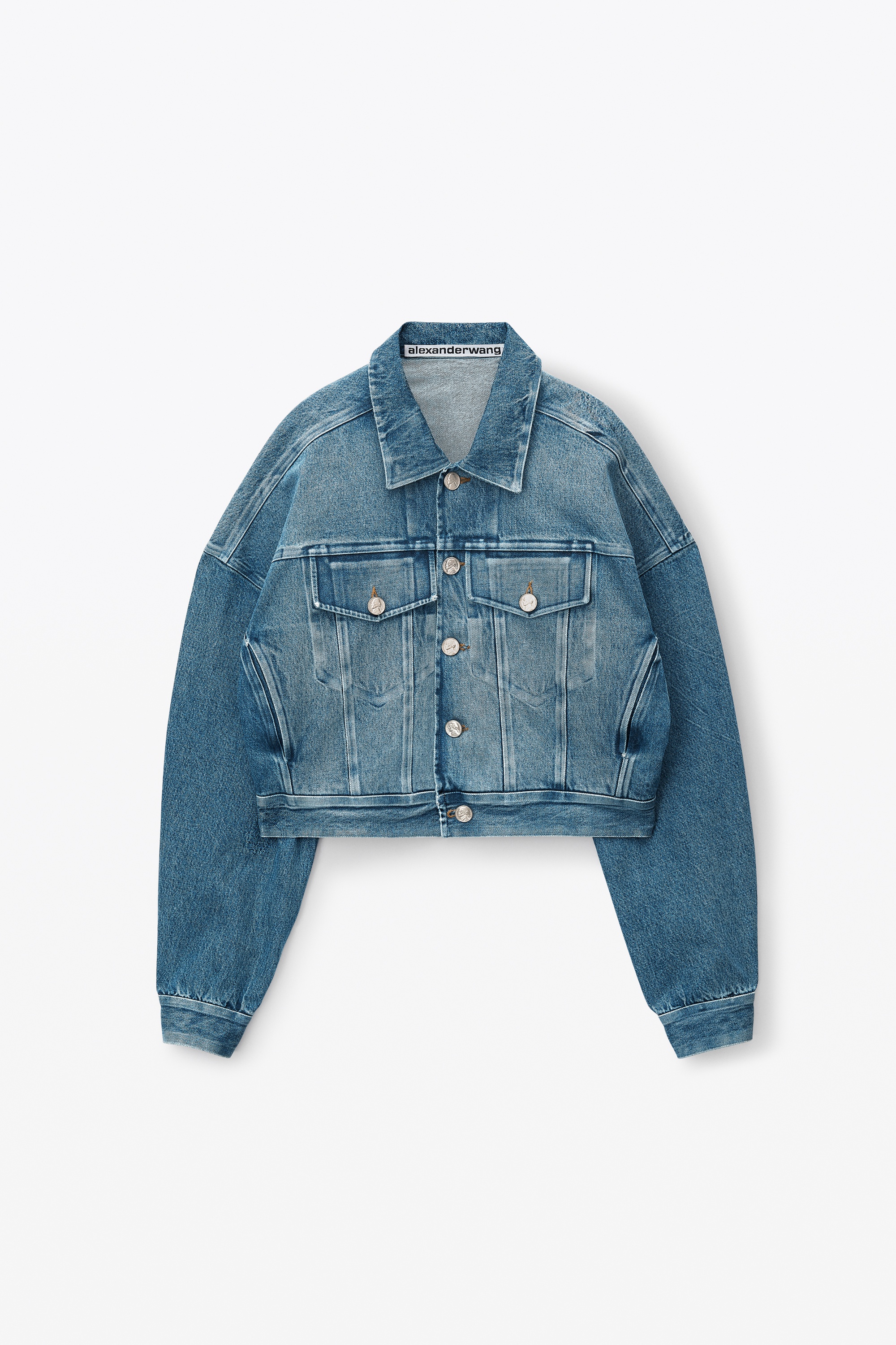 Classic rounded trucker jacket in denim with bonded seams, featured in a vintage medium indigo wash - subtle structured fit - Falls below the waist, sits at the high hip area - classic trucker detailing - center front shank closure resembles coins - body composition: 100% cotton - made in china - model is 5'11" and wears size s - 1WC1242233473 composition Body: 100%COTTON
