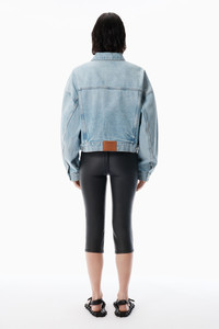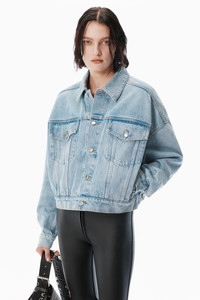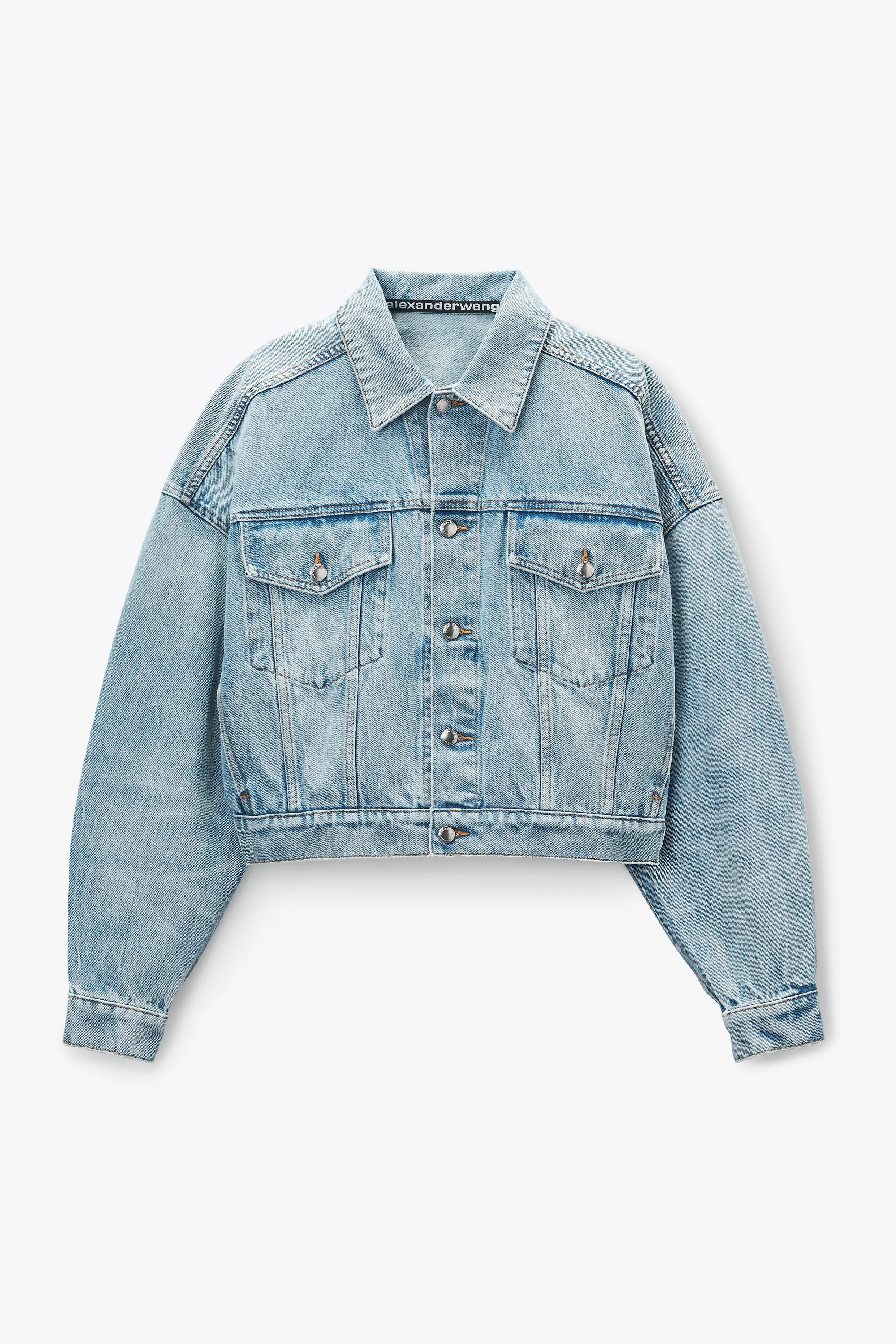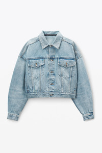 Designed with a shrunken silhouette, this vintage blue trucker jacket offers a snug fit, perfect for layering. The dropped sleeves and accentuated volume highlight the tight-fitting cropped shape, finished with chest pockets, shank buttons, and a logo patch at the back. - stand collar - long sleeves - zip closure - body composition: 100% cotton - made in china - 4DC3252777470C composition Body: 100%COTTON