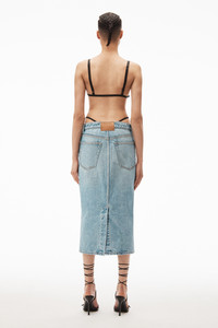 Vintage faded indigo midi skirt in chunky twill denim, featuring peekaboo diamanté charm thong straps at top of waistband - slim low rise fit - zipper fly closure and 5 pocket detailing - tan logo patch at back waistband - hits mid calf - unlined - composition: 100% cotton - made in china - model is 5'9" and wears size 26 - 4DC4235235471A