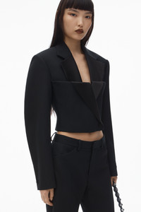 With its cropped cut, this black double-breasted wool blazer challenges notions of sartorial tailoring. A tucked bodice overlay creates a dimensional effect while gently curved sleeves and a wide cuff placket balance this stylized silhouette that hits below the waist. - notched collar - double-breasted closure - body composition: 100% wool - lining: 100% viscose - collar: 100% polyester - model is 5'9.5" and wears a size 4 - made in china - 1WC1252638001 composition Body/Exterieur: 100%WOOL (OVIS ARIES ARIES) Lining: 100%VISCOSE Collar: 100%POLYESTER