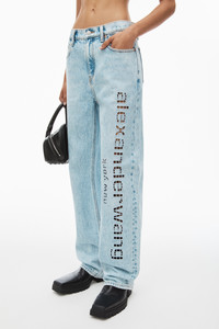 Mid-rise straight leg jean with cutout logo embroidery in bleach blue wash, featuring 5-pocket detailing and tan logo patch at back center waistband - relaxed fit - straight wide leg designed to stack at hem - zipper fly closure - body composition: 100% cotton - made in china - model is 5'9" and wears size 26 - 4DC1244221453 composition Body: 100%COTTON