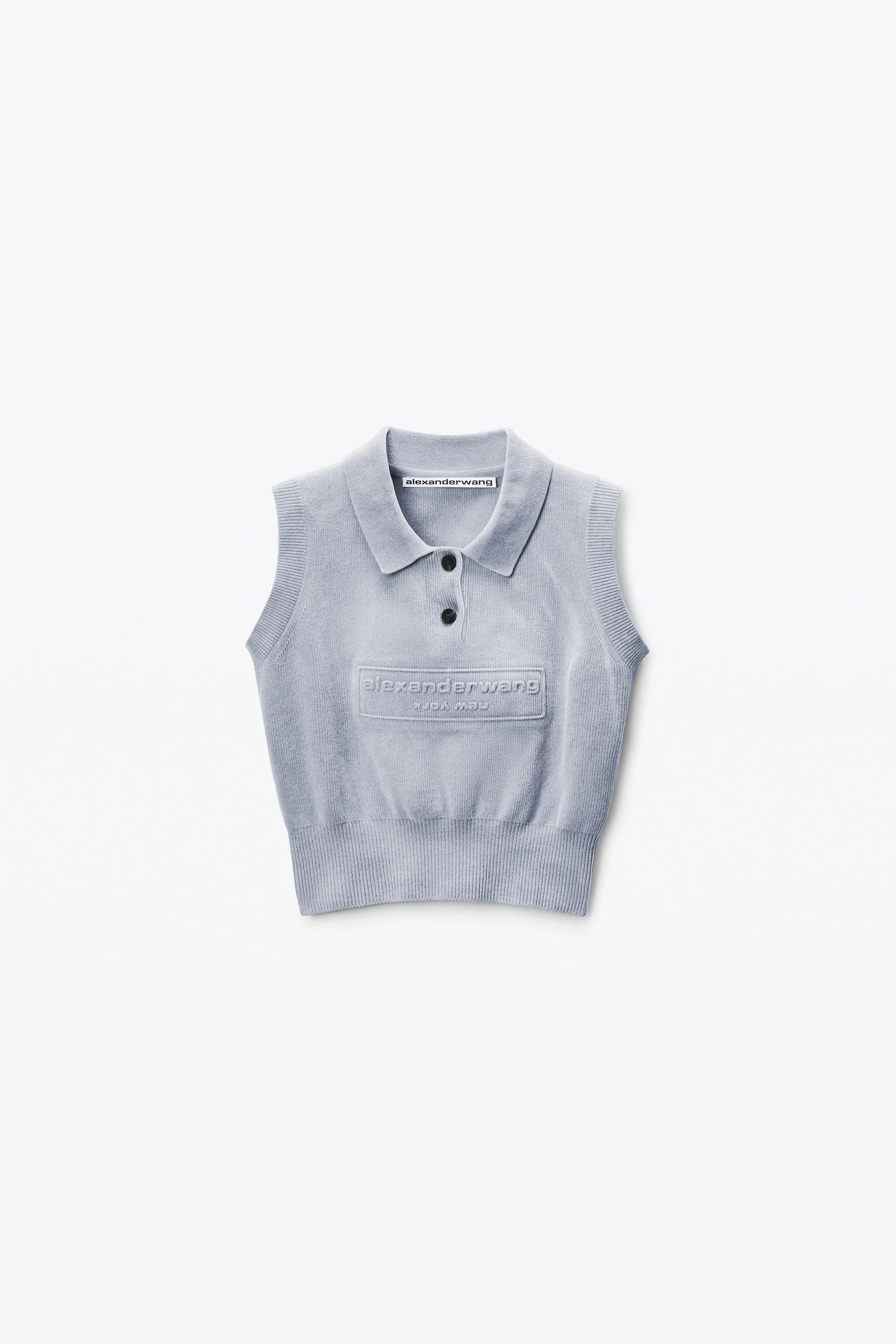 An embossed logo punctuates this polo vest, crafted from brushed cotton chenille that captures the tonal variations of the grey wash. Branded faux horn buttons lend an elevated touch to this transitional knitwear style. - crewneck - short sleeves - relaxed fit, hits at waist - body composition: 88% cotton/10% polyamide/2% elastane - hits above waist - model is 5'10" and wears a size s - made in china - 1KC3251056057 composition Body: 88%COTTON/10%POLYAMIDE/2%ELASTANE Trim: 89%COTTON/10%POLYAMIDE/1%ELASTANE