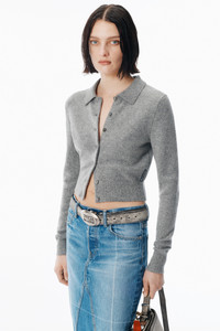 Rendered in heather grey boiled wool, this mid-weight ribbed polo cardigan features a fitted, waist-length silhouette with long sleeves. Embellished with over 78,000 crystal hotfix elements, it’s finished with a full-needle rib collar, classic 1x1 rib trims, and a woven alexanderwang logo at the side seam. - polo collar - long sleeves - button closure - fitted, waist-length silhouette - body composition: 92% wool / 7% polyamide / 1% elastane - model is 5'11" and wears a size s - made in China - 1KC4253021030 composition Body: 92%WOOL (OVIS ARIES ARIES)/7%POLYAMIDE/1%ELASTANE Rib: 92%WOOL (OVIS ARIES ARIES)/7%POLYAMIDE/1%ELASTANE