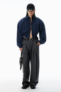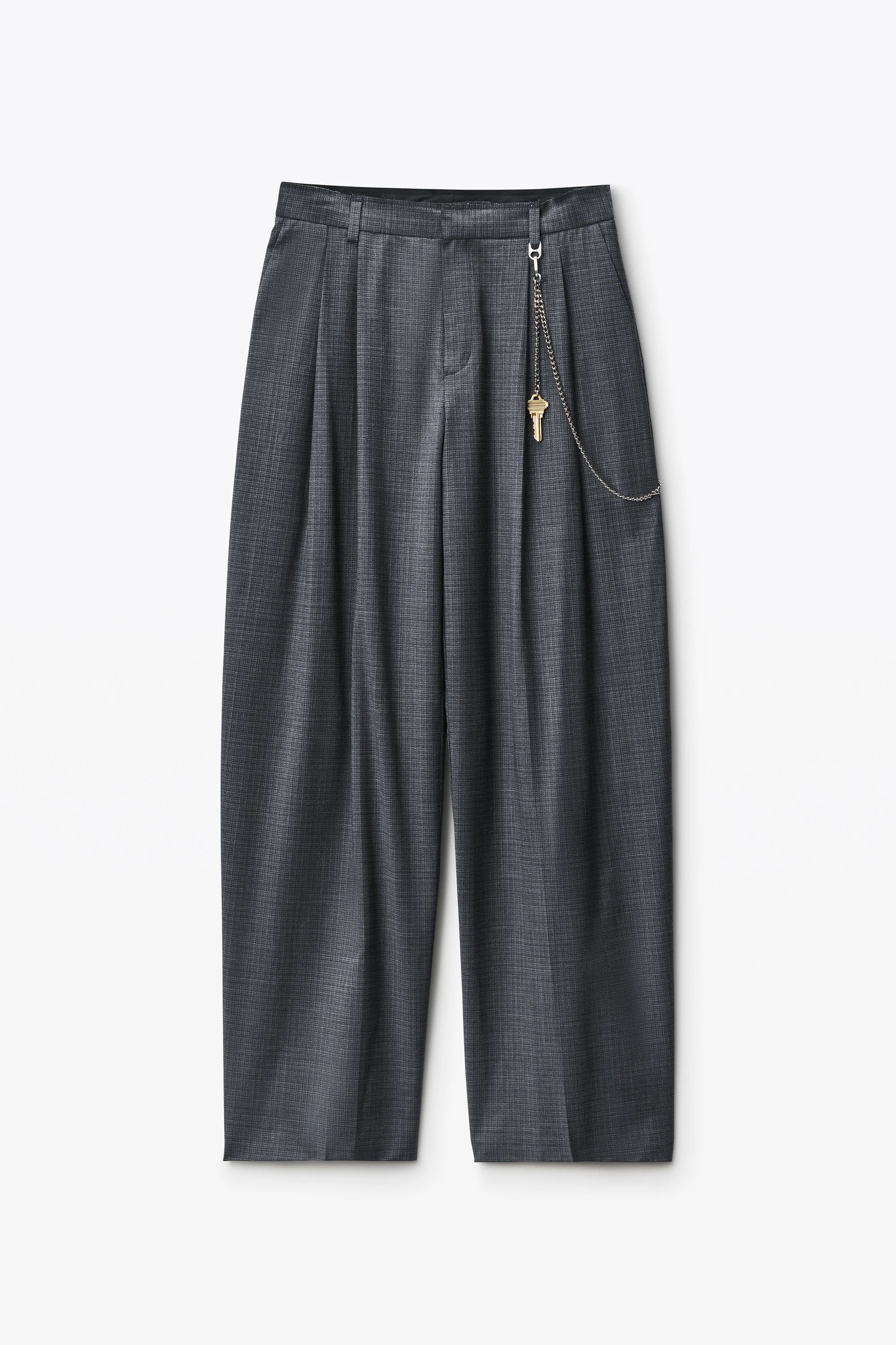 Cut in a mid-rise balloon leg with a double-pleat front and articulated back knee, these grey melange wool pants feature a cut-off effect waistband. Allover pressed creasing and a stacked leg emphasize the tailored styling, while a detachable chain belt completes the look. - zip fly - front and back welt pockets - front fly - body composition: 86% wool/10% polyamide/4% elastane - lining: 100% viscose - made in china - model is 5’11" and wears a size 4 - 1WC3254871085 composition Body: 86%WOOL (OVIS ARIES ARIES)/10%POLYAMIDE/4%ELASTANE Lining: 100%VISCOSE