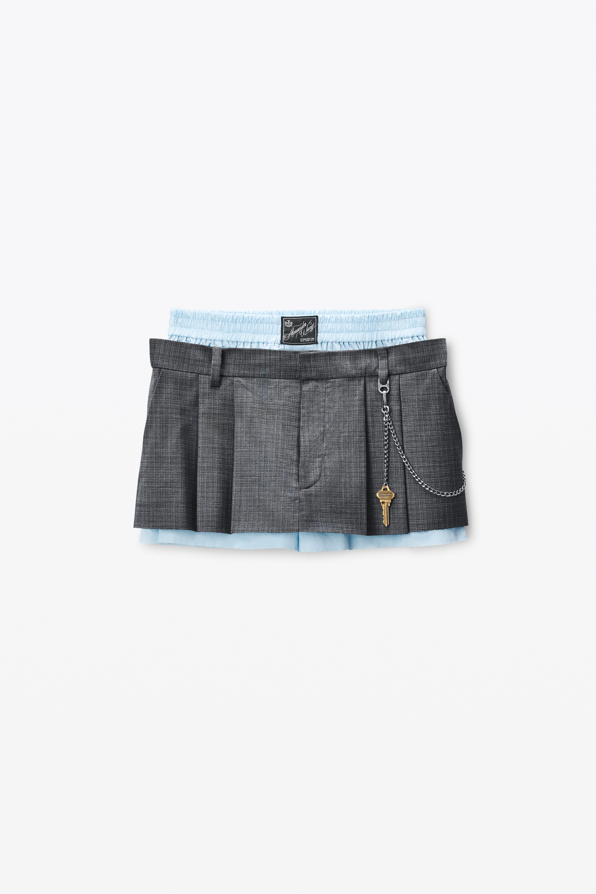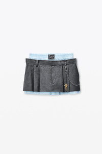 Crafted from a wool blend, this grey melange pleated miniskirt features a pre-styled boxer short waistband and a detachable belt chain with a branded key. - belt loops - side slash and back pockets - front fly - body composition: 86% wool/10% polyamide/4% elastane - inner short: 100% cotton - lining: 100% viscose - made in china - model is 5’11" and wears a size 4 - 1WC3254855055 composition Body: 86%WOOL (OVIS ARIES ARIES)/10%POLYAMIDE/4%ELASTANE Inner Short: 100%COTTON Lining: 100%VISCOSE