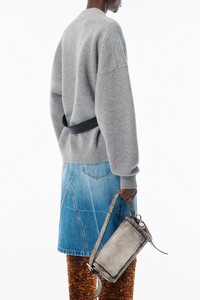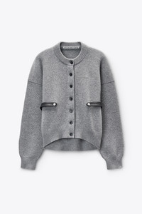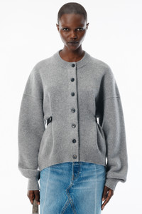 Long sleeve cardigan in soft grey wool-cotton with an oversized fit and draped open back. Features tonal alexanderwang embroidery at the chest, logo horn buttons at the front placket, and detachable leather tabs with metal logo snaps for waist shaping. - front-button placket - draped open back - oversized fit, hits at waist - hits at waist - logo embroidery at chest - detachable leather tabs with logo metal snaps - model is 5'11" and wears a size s - body composition: 53% wool / 25% polyamide / 21% cotton / 1% elastane - made in China - 1KC4253058030 composition Body: 53%WOOL (OVIS ARIES ARIES)/25%POLYAMIDE/21%COTTON/1%ELASTANE Rib: 54%WOOL (OVIS ARIES ARIES)/25%POLYAMIDE/20%COTTON/1%ELASTANE Belt: 100%COW LEATHER