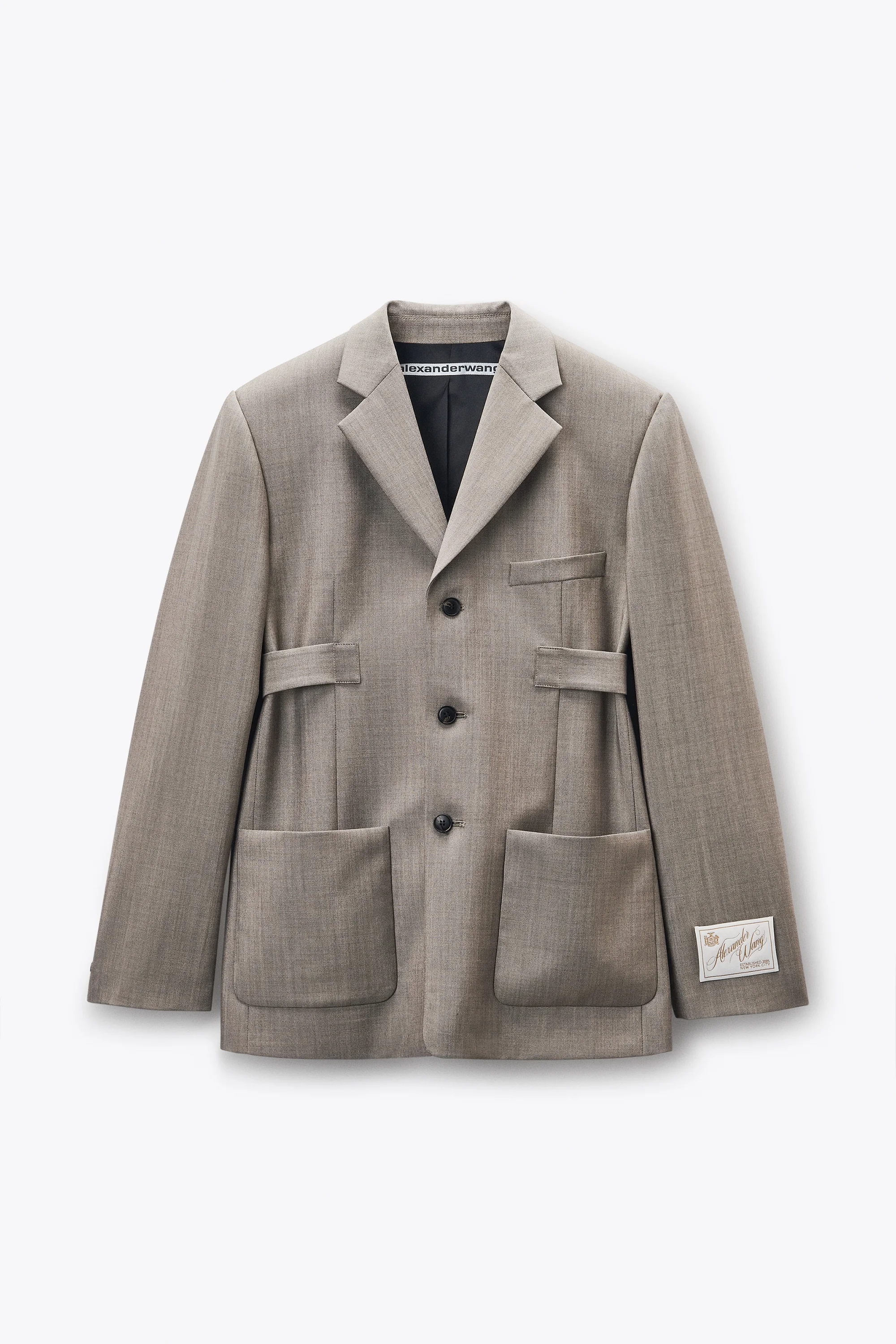 tailored in grey wool mohair suiting, this structured blazer features a center-front button closure and adjustable back tabs. three patch-style pockets and branded tailoring details complete the silhouette. - single welt chest pocket - two front patch pockets - three-button front closure - adjustable back tabs - three-button cuffs - branded tailoring label at cuff - single back vent - body composition: 77% wool / 23% mohair - model is 5'11" and wears a size s - made in China - 1WC4252673213A composition Body: 77%WOOL (OVIS ARIES ARIES)/23%MOHAIR Lining: 100%VISCOSE