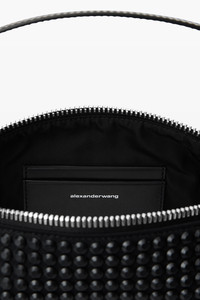 This rectangular bag showcases tonal 3D rubberized spikes in black. It is finished with a leather strap. - leather strap handle with white printed emboss/deboss logo - metal top zipper closure - one main compartment and two card slot patch pockets - jacquard logo lining - composition: 80% polyurethane/ cowhide - lining: 100% polyester - dimensions: 30x10x6cm - made in Vietnam - 20324P05M001 composition Body: 80%POLYURETHANE/20%COWHIDE Lining: 100%POLYESTER