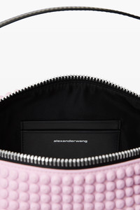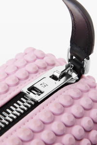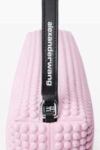 This rectangular bag showcases tonal 3D rubberized spikes in pink lavender. It is finished with a leather strap. - leather strap handle with white printed emboss/deboss logo - metal top zipper closure - one main compartment and two card slot patch pockets - jacquard logo lining - composition: 80% polyurethane/cowhide - lining: 100% polyester - dimensions: 30x10x6cm - made in Vietnam - 20324P05M697A composition Body: 80%POLYURETHANE/20%COWHIDE Lining: 100%POLYESTER