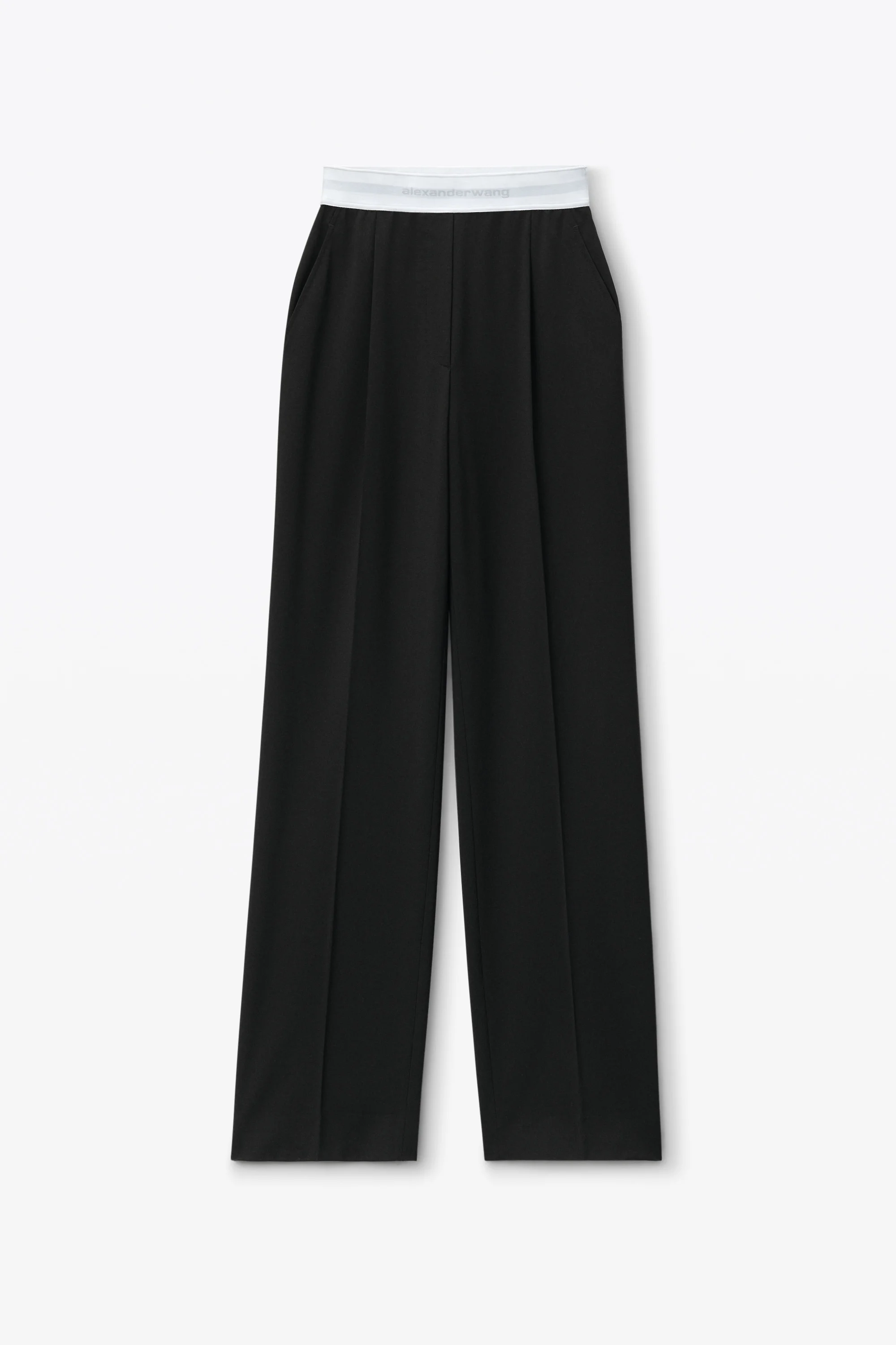 A logo-detailed elastic waistband enhances this black pleated pant. It is detailed with side slash and welt pockets. - logo elastic waistband - side & welt pockets - body composition: 86%wool/9% polyamide/5% elastane - made in China - boxy fit, hits at upper thigh - model is 5’11 and wears a size 2 - 1WC3244748001 composition Body: 86%WOOL (OVIS ARIES ARIES)/9%POLYAMIDE/5%ELASTANE LINING: 100%POLYESTER ELASTIC: 71%POLYAMIDE/19%POLYESTER/10%ELASTANE