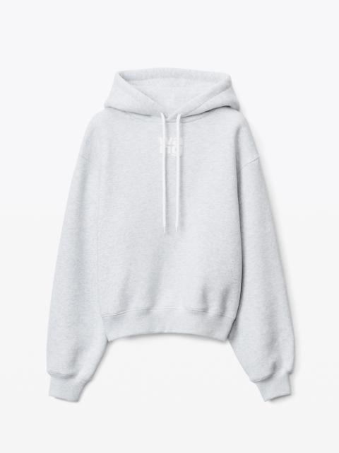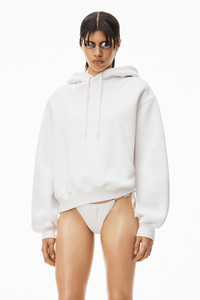 white long-sleeve heavy brushed structured terry hoodie with a stacked puff paint logo - relaxed fit - hip-length bottom hem - ribbed sleeve cuffs and bottom hem - composition: cotton, polyester - made in china - model is 5'9" and wears size s - 4CC3222069100