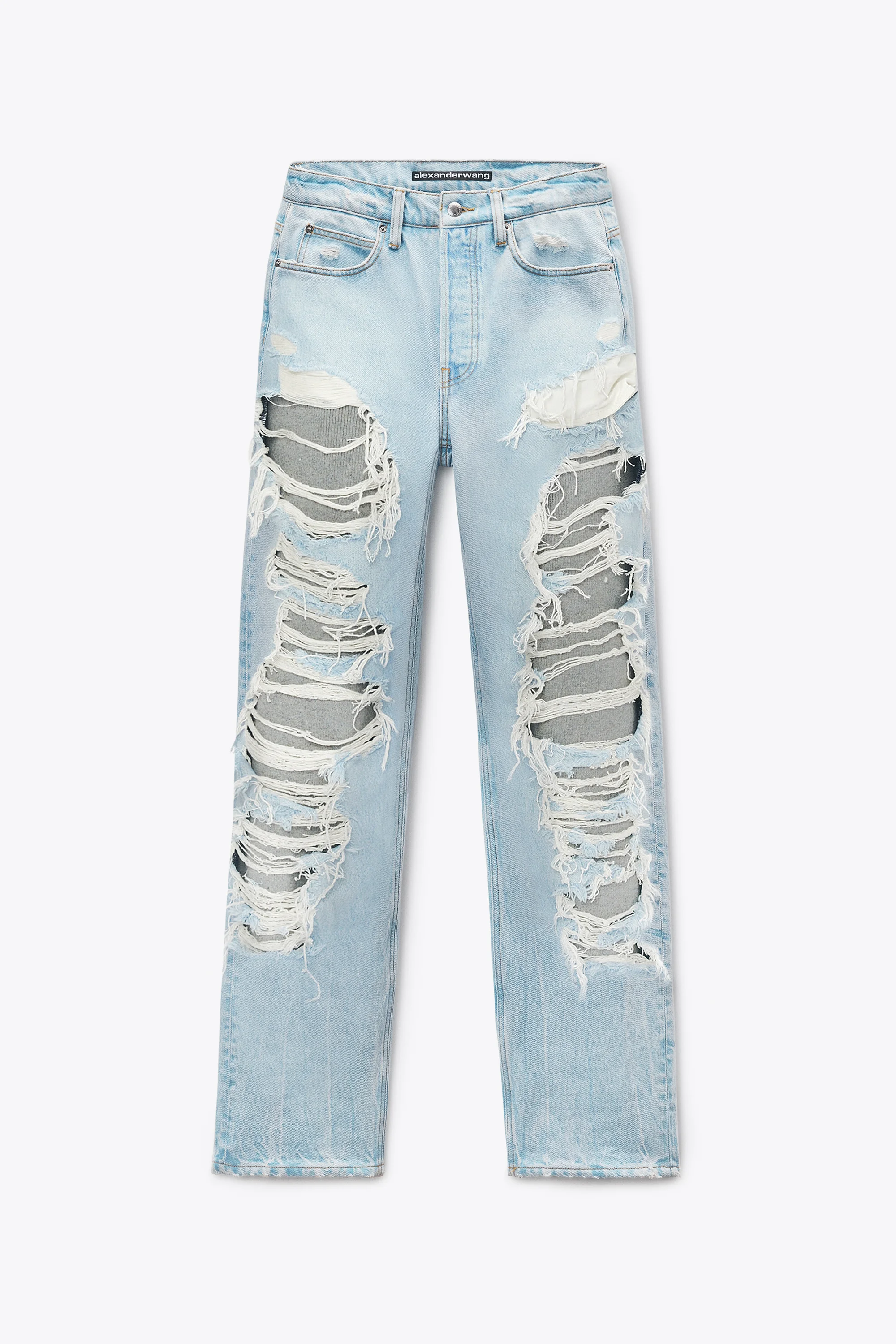Distressed straight-leg jeans in light bleach regen indigo cotton denim with charcoal grey knit jersey backing at front and back destruction. Features a relaxed fit with a wide leg designed to stack at the hem. Includes five-pocket construction, zip fly closure, and a tan logo patch at the center back waistband. - belt loops - zip fly closure - classic five-pocket styling - body composition: 100%cotton - model is 5'11" and wears a size 27 - made in Turkey - 4DC4254851494 composition Body: 100%COTTON Lining: 49%POLYAMIDE/43%COTTON/7%ALPACA/1%ELASTANE