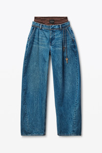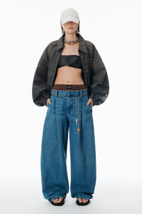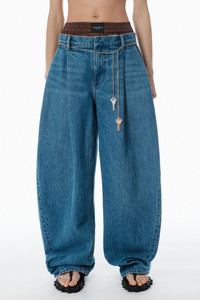 These pre-styled jeans feature a boxer-style waistband and a chain belt. These pleated balloon-leg pants, in a deep blue wash, are punctuated by a chain belt with key detailing. - zip fly, hook-and-bar closure - body composition: 100% cotton - trim: 100% cotton - model is 5'10" and wears a size 27 - made in china - 4DC3254754401 composition Body: 100%COTTON Trim: 100%COTTON