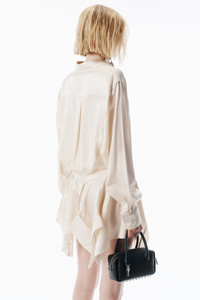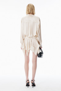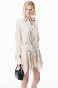Pre-styled shirt dress constructed in ivory silk charmeuse, built from an oversized shirt silhouette with a deconstructed, multi-shirt skirt. Two shirts are buttoned together to form the skirt, with raw-cut sleeves and turned-up collars creating an uneven hem and waistband. Finished with classic logo embroidery at the chest pocket. - button-front placket - chest pocket with classic logo embroidery - low waist - hits at high thigh - body composition: 100% silk - model is 5'11" and wears a size 4 - made in China - 4WC4256872106 composition Body: 100%SILK
