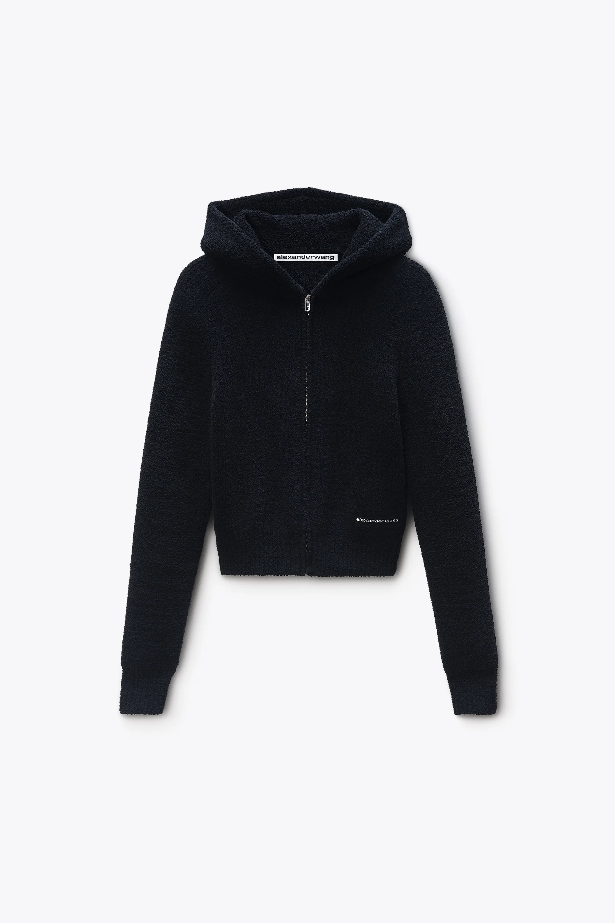 Black hoodie in logo ribbed polar fleece. Designed in a shrunken silhouette with saddle sleeves, technical yarn logo patch, and a self-lined hood. - Black - Ribbed cuffs and hem - Body composition: 95% polyester, 4% polyamide, 1% elastane - Trim: 95% polyester/ 4% polyamide/1% elastane - Made in China - Model is 5'11" and Wears a Size S - Made in China - 4KC1263080001 composition Body: 95%POLYESTER/4%POLYAMIDE/1%ELASTANE Rib Trim: 95%POLYESTER/4%POLYAMIDE/1%ELASTANE