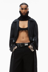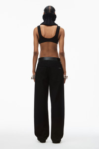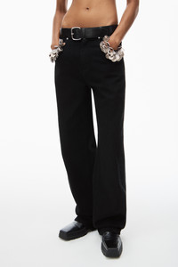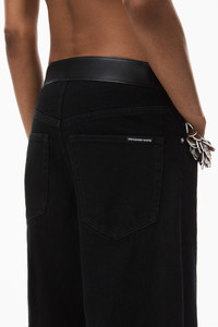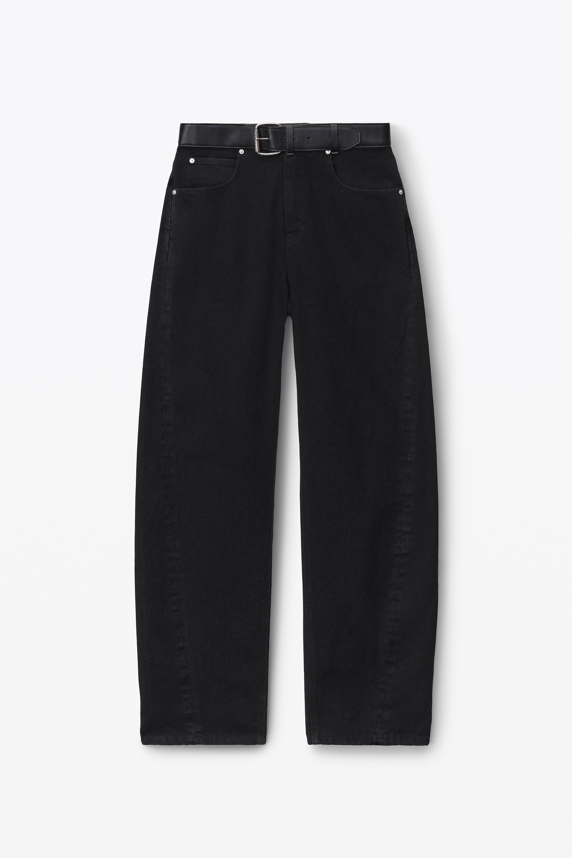 Mid-rise wide-leg balloon jean in washed black with classic 5-pocket detailing, twisted side seam detail, and seamed black leather belt waistband - relaxed fit designed to stack - full length - button fly closure - silver roller buckle - skinny logo label at back pocket - body composition: 100% cotton - belt composition: 100% cow leather - made in china - model is 5'11" and wears size 26 - 1WC1244251011 composition Body: 100%COTTON Belt Face: 100%COW LEATHER Belt Back: 100%COW LEATHER