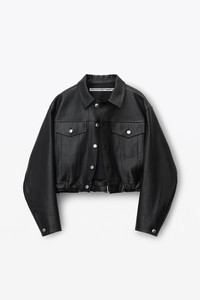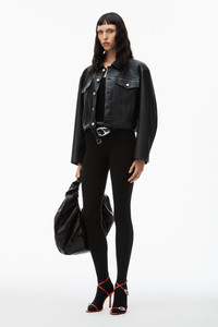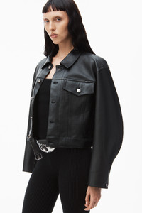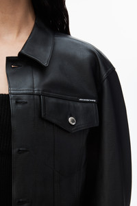 Black jean-style jacket in tumbled moto leather with partially-encased thin leather belt at waistband and denim shank closure at front - hits at high hip - metal zippers at side pockets - logo label above left chest pocket - lined - body composition: 100% calfskin - lining composition: 100% viscose - belt composition: 100% cow leather - made in china - model is 5'11" and wears size s - 1WC1242509001 composition Body: 100%CALFSKIN Lining: 100%VISCOSE Belt: 100%COW LEATHER