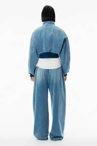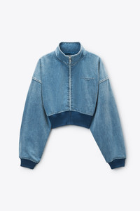 Funnel neck jacket in washed light blue brushed indigo denim, designed with a dropped shoulder and loose fit. Cropped and cinched at the waist with a tall ribbed hem, it features a zip front closure and a silicone-filled classic logo at the chest. - funnel neckline - zip front closure - dropped shoulder construction - loose, cropped fit - wide ribbed hem - model is 5'11" and wears a size S - body composition: 62% cotton / 38% polyester - made in China - 4DC4252921458A composition Body: 62%COTTON/38%POLYESTER Rib: 65%COTTON/27%POLYESTER/8%ELASTANE Lining: 100%COTTON
