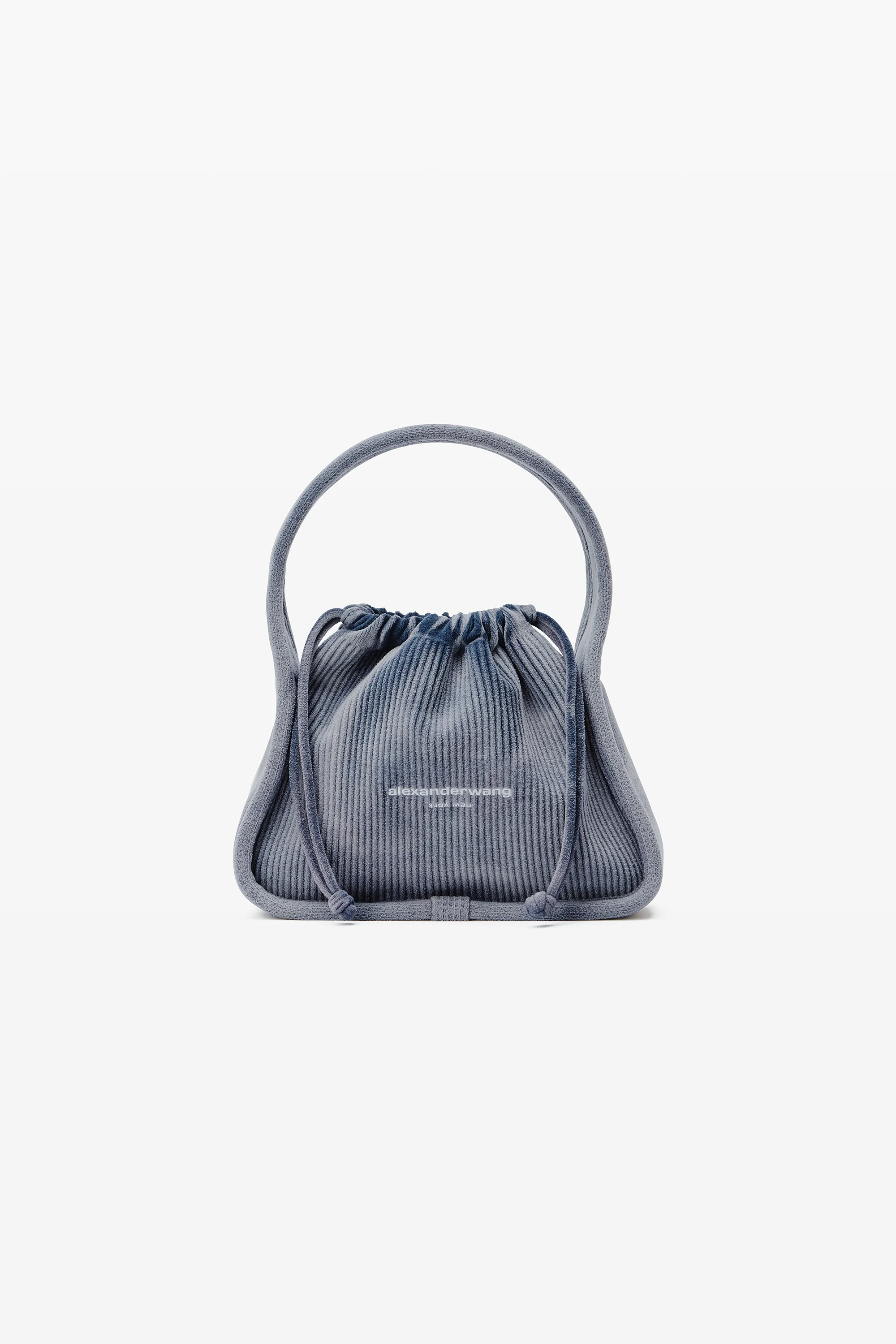 small engineered rib-knit bag in light blue cotton chenille. inspired by a dust-bag shape, this handle bag features a drawstring closure and a logo at the center front. - fixed length strap handle - single main compartment - interior backwall pocket - body composition: 89% cotton/11% nylon - dimensions: 25 x 8 x 19 cm / 9.8 x 3.1 x 7.5 in - handle drop: 15 cm / 5.9 in - made in china - 20424K41T458A composition Body: 89% COTTON 11% NYLON