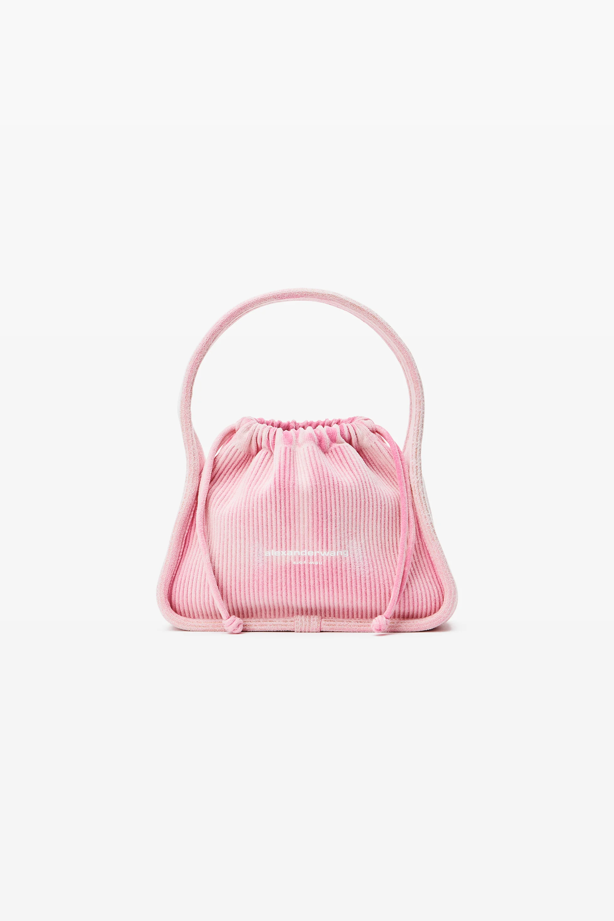 small engineered rib-knit bag in pink cotton chenille. inspired by a dust-bag shape, this handle bag features a drawstring closure and a logo at the center front. - fixed length strap handle - single main compartment - interior backwall pocket - body composition: 89% cotton/11% nylon - dimensions: 25 x 8 x 19 cm / 9.8 x 3.1 x 7.5 in - handle drop: 15 cm / 5.9 in - made in china - 20424K41T674B composition Body: 89% COTTON 11% NYLON
