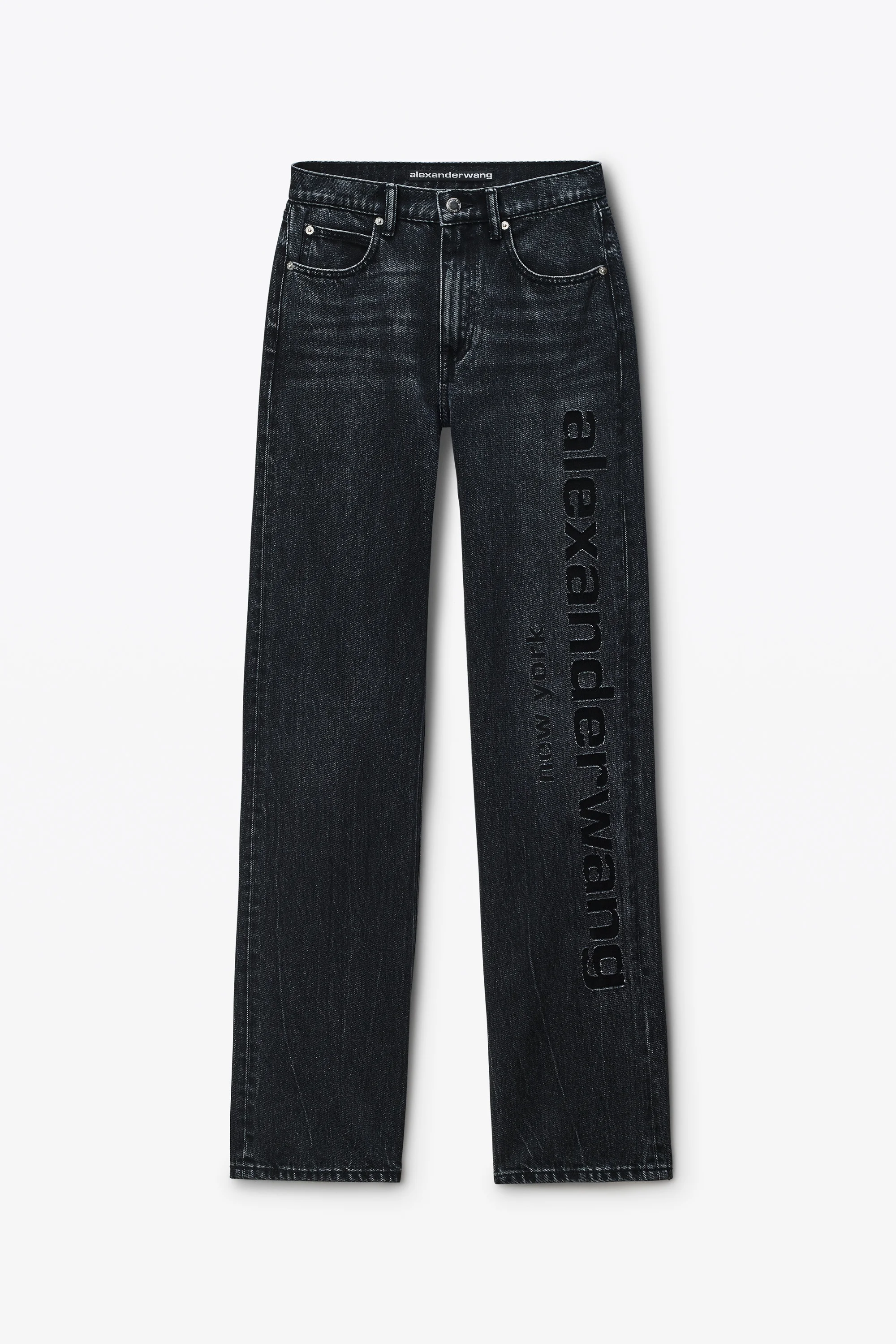 A laser logo cutout at the front with bonded mesh defines these mid-rise jeans. These grey aged denim pants have a relaxed top block and a straight leg. - belt loops - five-pocket style - front fly - body composition: 100% cotton - made in china - model is 5’11" and wears a size 27 - 4DC3254837031 composition Body: 100%COTTON Trim: 100%POLYESTER