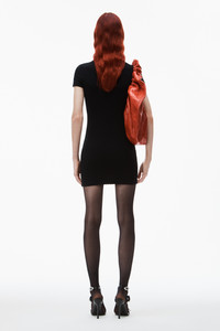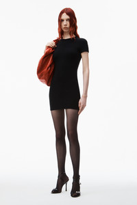 Black crew neck short sleeve mini dress in stretch logo jacquard. - tight fit - hits at high thigh - unlined - composition: 97% polyamide/3% elastane - made in china - model is 5'11" and wears size s - 4CC1246235001 composition Body: 97%POLYAMIDE/3%ELASTANE