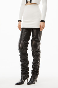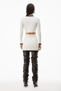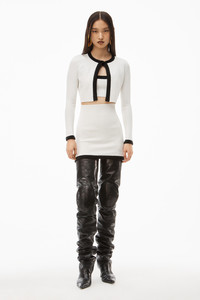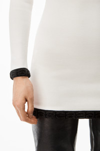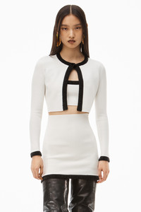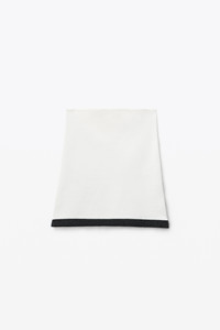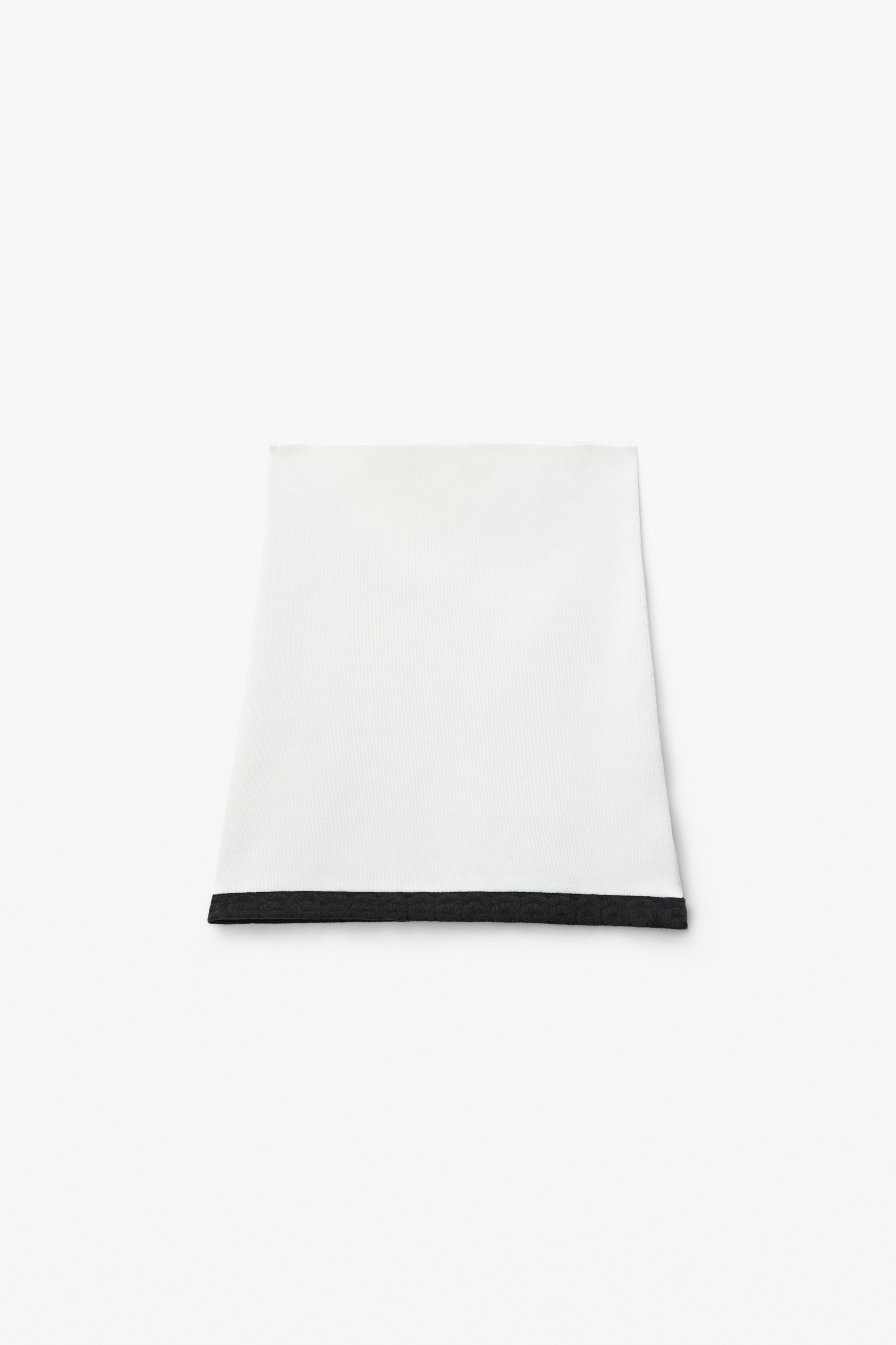 white form-fitting mini skirt in chenille viscose with black logo knit jacquard trim along bottom hem - bottom hem hits at upper hips - model is 5'10" and wears size s - composition: 60%VISCOSE/39%POLYAMIDE/1%ELASTANE - made in china - 4KC1225012971