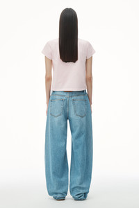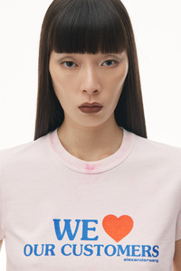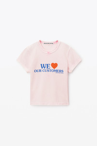 Featuring a "we love our customers" graphic print at the front, this light pink tee in compact jersey is cut to a slightly shrunken fit and features a classic ribbed neckline. It's overdyed and treated with a bleached wash, which gives each t-shirt a unique finish. - pulls over - this garment is overdyed and treated with a bleach wash which means no two garments are exactly the same - body composition: 100% cotton - rib composition: 99% cotton, 1% elastane - made in portugal - slightly relaxed fit, hits at natural waist - model is 5’10 and wears a size XS - 1CC2241885683A composition Body/Exterieur: 100%COTTON Rib 1/Tricot Cotele: 99%COTTON/1%ELASTANE