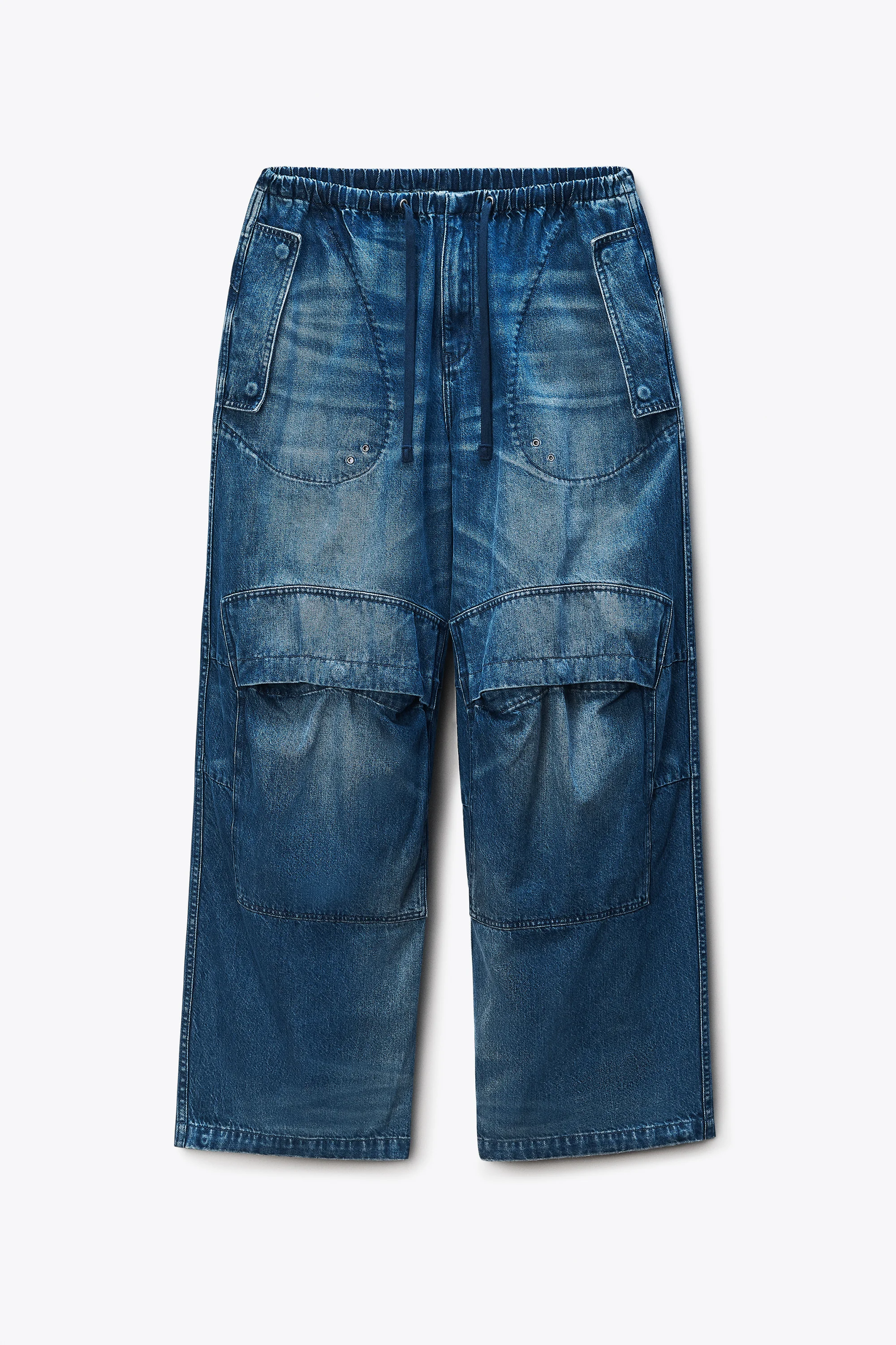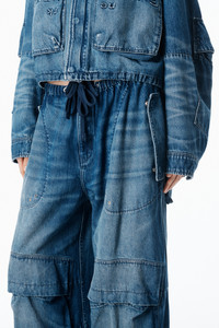 Tinted medium indigo denim reworked into an oversized cargo silhouette. Detailed with adjustable waist tabs, drawcord hems, and articulated snap pockets for a utilitarian finish. - Tinted Medium Indigo - Drawcord waistband - Cargo pockets - Body Composition: 100% cotton. - Model is 5'11" and Wears a Size S - Made in Turkey - 4DC1264947427E composition Body: 100% COTTON