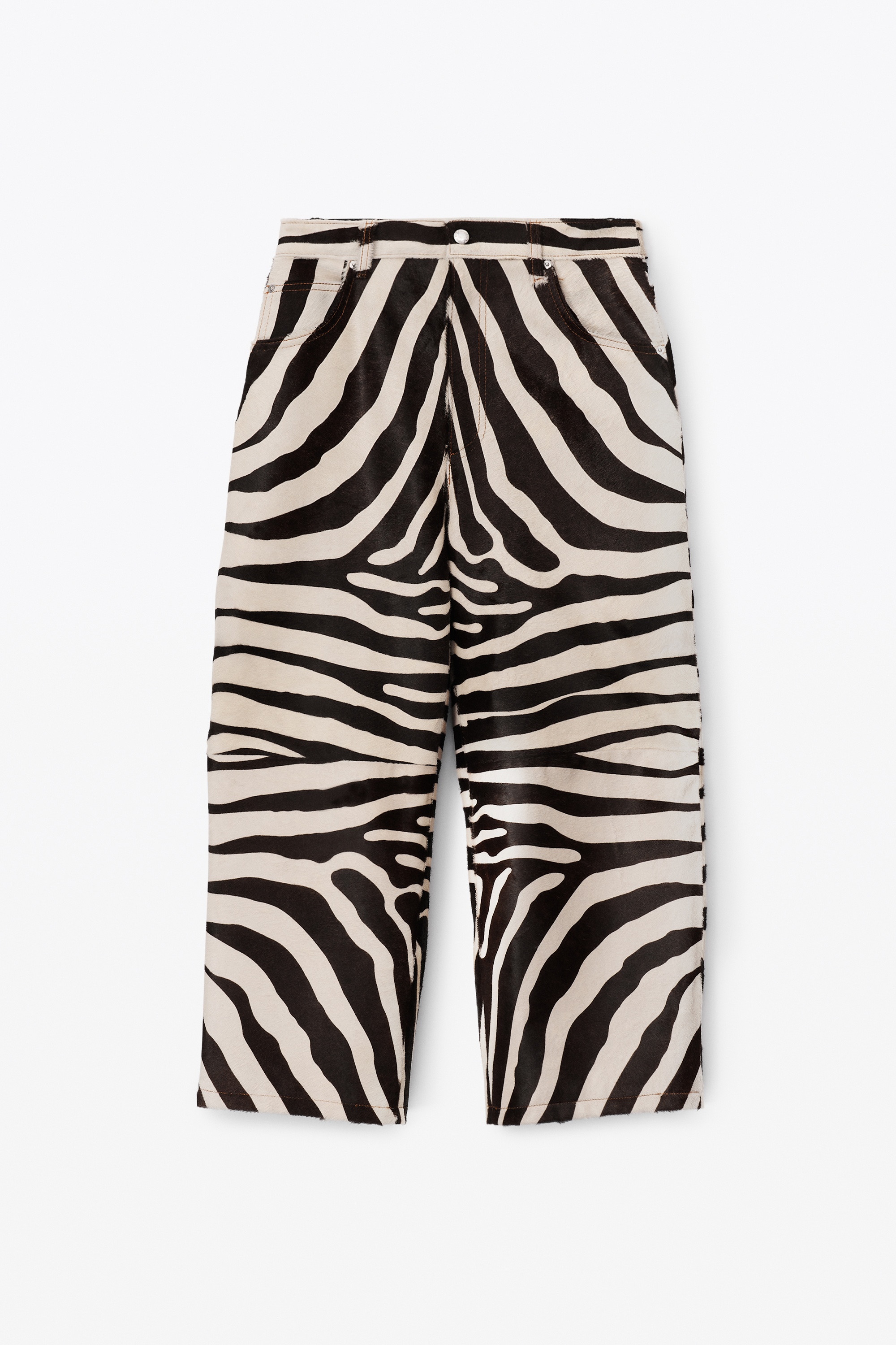 Black and white zebra printed low rise pant in calf hair with embossed logo at back waistband and classic 5-pocket detailing - relaxed loose fit - shank and hidden zipper fly closure - hits ankle - lined - exterior composition: 100% calf hair/ lining: 100% polyester - made in china - model is 5'9" and wears size s - 1WC4234658965