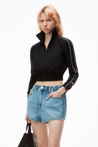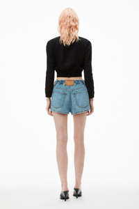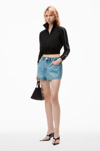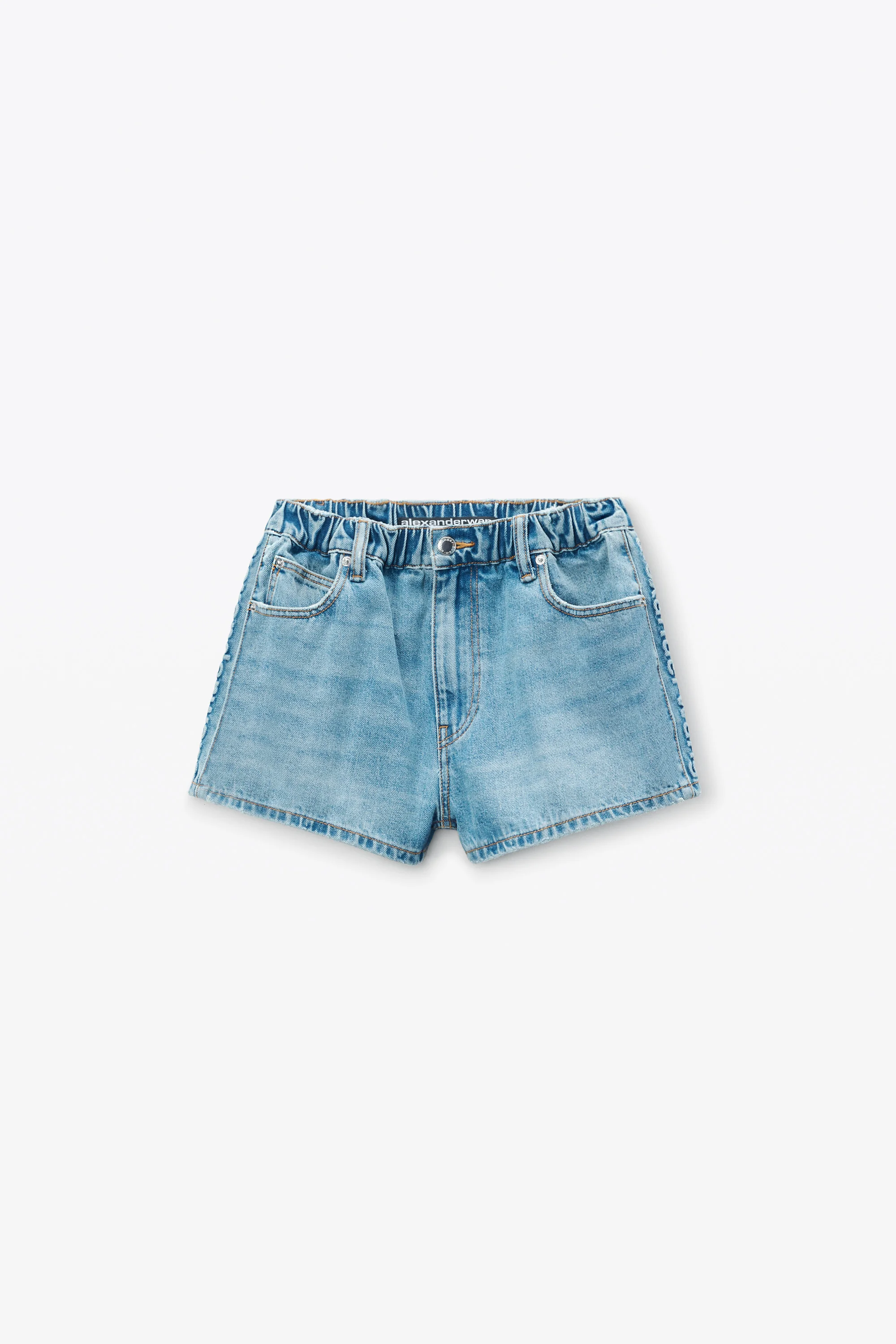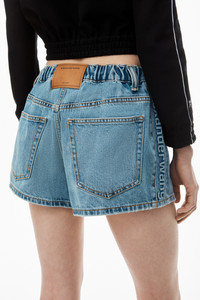 This marathon short boasts logo embossed side panels elevating this casual denim separate. This style features a five-pocket design and is fastened with an elastic waistband. - five-pocket style - belt loops - zip fly, button closure, elastic waistband - body composition: 62%COTTON/23%POLYACTIDE/15%LYOCELL - relaxed fit, hits at waist - made in China - model is 5’8 and wears a size 27 - 4DC3244398486 composition Body: 62%COTTON/23%POLYACTIDE/15%LYOCELL