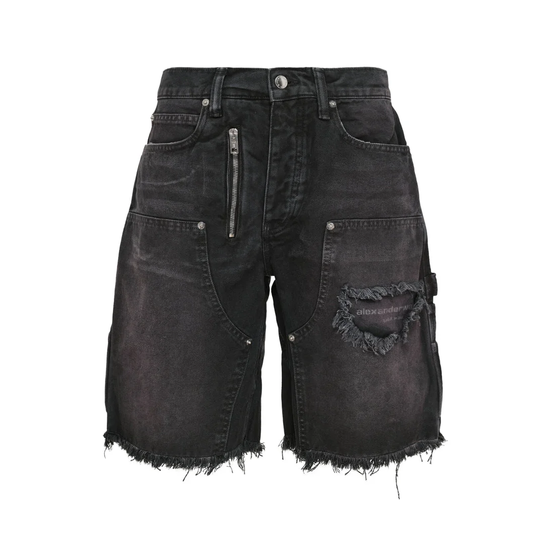 600083908BLK024 / 4DC2264160/00/011D - Mid-rise waist with button closure - Front zip fly - Multiple cargo pockets with snap closures - Distressed detailing and rips - Raw frayed hem - Industrial metal hardware - Relaxed carpenter fit Alexander Wang Mid Rise Carpenter Shorts delivers contemporary streetwear with utilitarian construction and modern edge. Crafted from premium distressed denim in washed black, featuring multiple cargo pockets and industrial hardware details throughout. The mid-rise fit and frayed hem construction create a bold statement piece with signature Alexander Wang aesthetic.