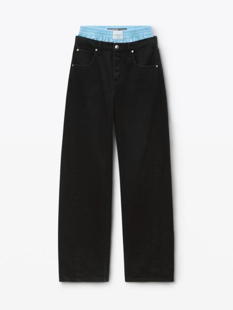 Cut in a mid-rise fit with a straight/slouchy leg, this indigo wash jean boasts a pre-styled thong detail. It features a diamante logo charm at the back, straps with a slider, and a slider to customize to one's ideal fit and silhouette. - belt loops - five-pocket style - zip fly, button closure - body composition: 100% cotton - oversize fit, hits at hip - made in China - model is 5’11 and wears a size 27 - 4DC3244408471A composition Body: 100%COTTON