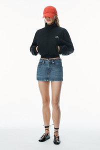 mid-rise stretch mini skort with classic denim pockets in deep blue washed comfort stretch denim - slim fit - bottom hem hits at high thigh - tan leather logo patch - composition: 55% cotton / 44% lyocell / 1% elastane - made in china - model is 5' 9.5" and wears a size 26 - 4DC3235595401