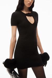 Black v-neck short sleeve mini dress in a stretch alpaca blend, with hand-crochet triple-link knit detail at neckline - bodycon fit - rib trim at cuff and hem - hem hits at mid thigh - composition: 64% alpaca/ 23% polyamide/ 2% wool/ 1% elastane - made in china - model is 5'11" and wears size s - 1KC4231015001